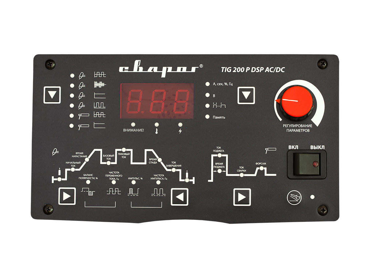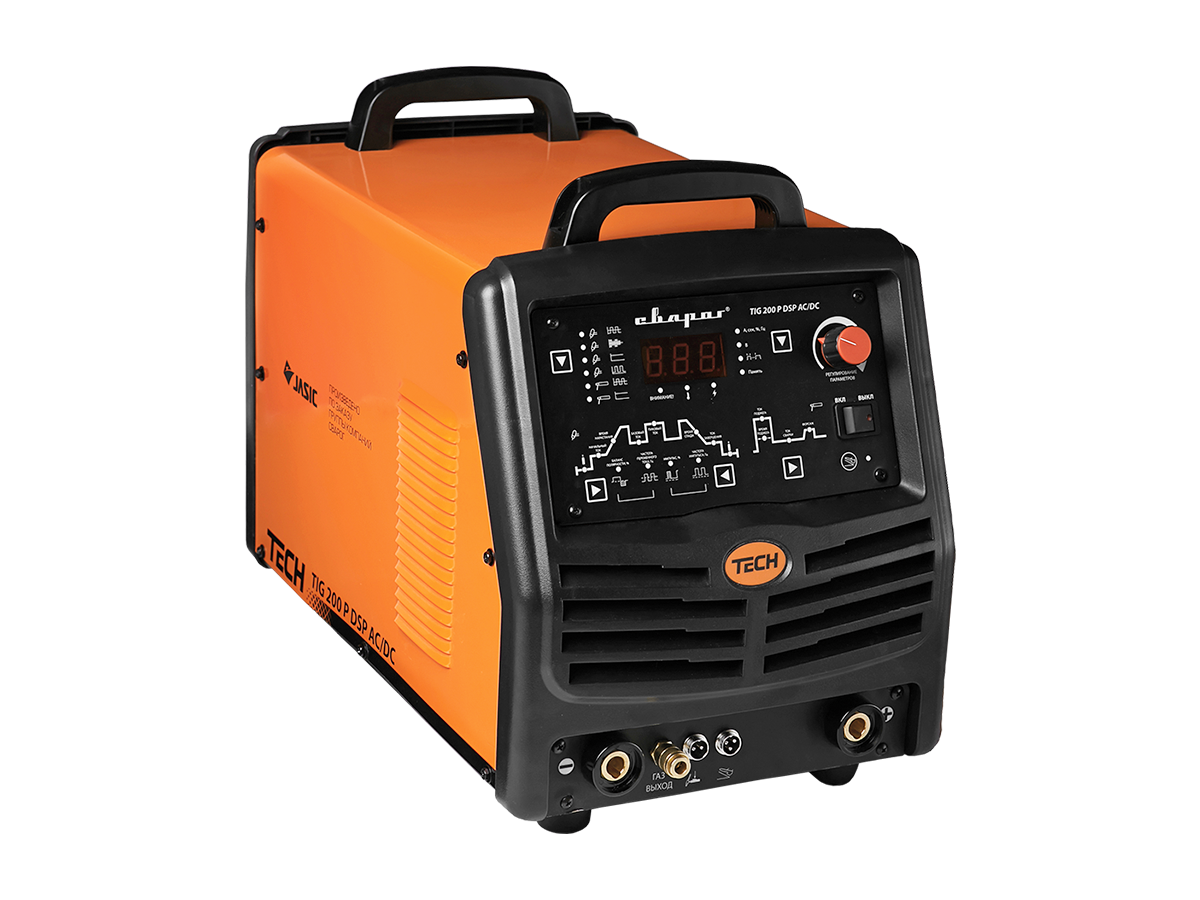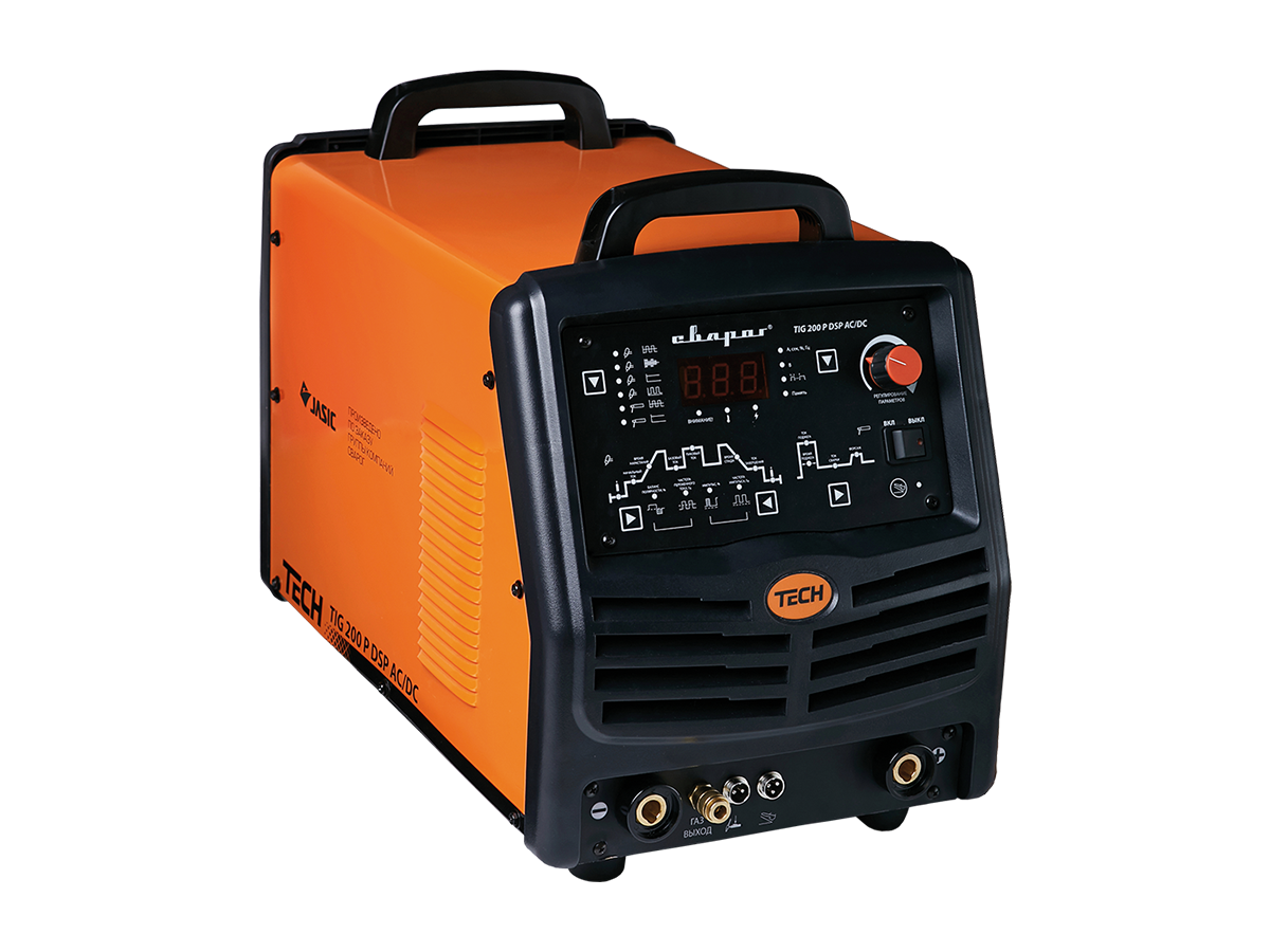 - надёжность и производительность. Благодаря мощной системе охлаждения и продуманной конструкции, TECH TIG 200 P DSP AC/DC (E104) легко переносит значительные эксплуатационные нагрузки. КПД — 85%, продолжительность включения — 60%;