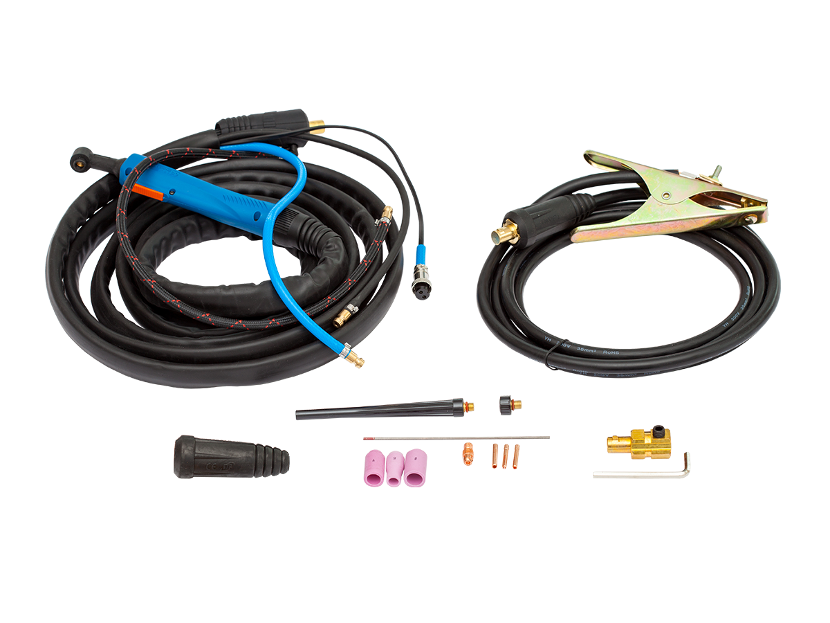 Аппарат комплектуется сварочной горелкой с водяным охлаждением и быстросъемными разъемами для подключения воды и смкси инертных газов. Для режима MMA в комплект включен кабель с держателем плавких электродов. В аппарате предусмотрены разъемы для подключения кулера или для подачи проточной воды от любого источника.