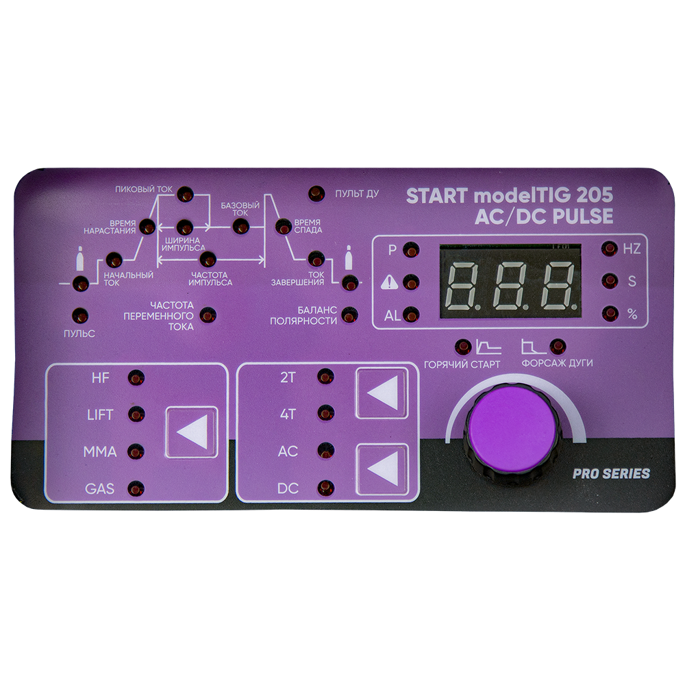 Благодаря расширенной панели управления сварщик может точно задать частоту AC, баланс, амплитуду, импульсный ток, время спада, постгаз и другие параметры. Дополнительно доступен режим MMA-сварки — для сварки штучными электродами.