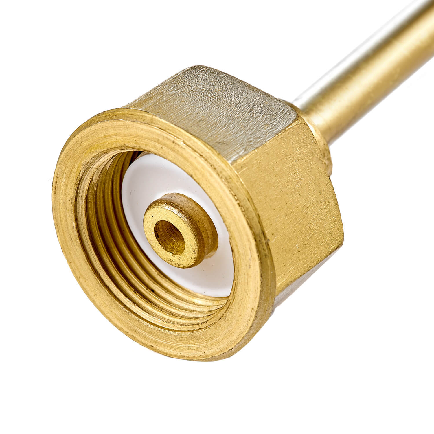 Переходник рассчитан на перекачку газов из баллонов объемом 40 л. Накидные гайки и полиуретановые прокладки обеспечивают герметичность соединений.