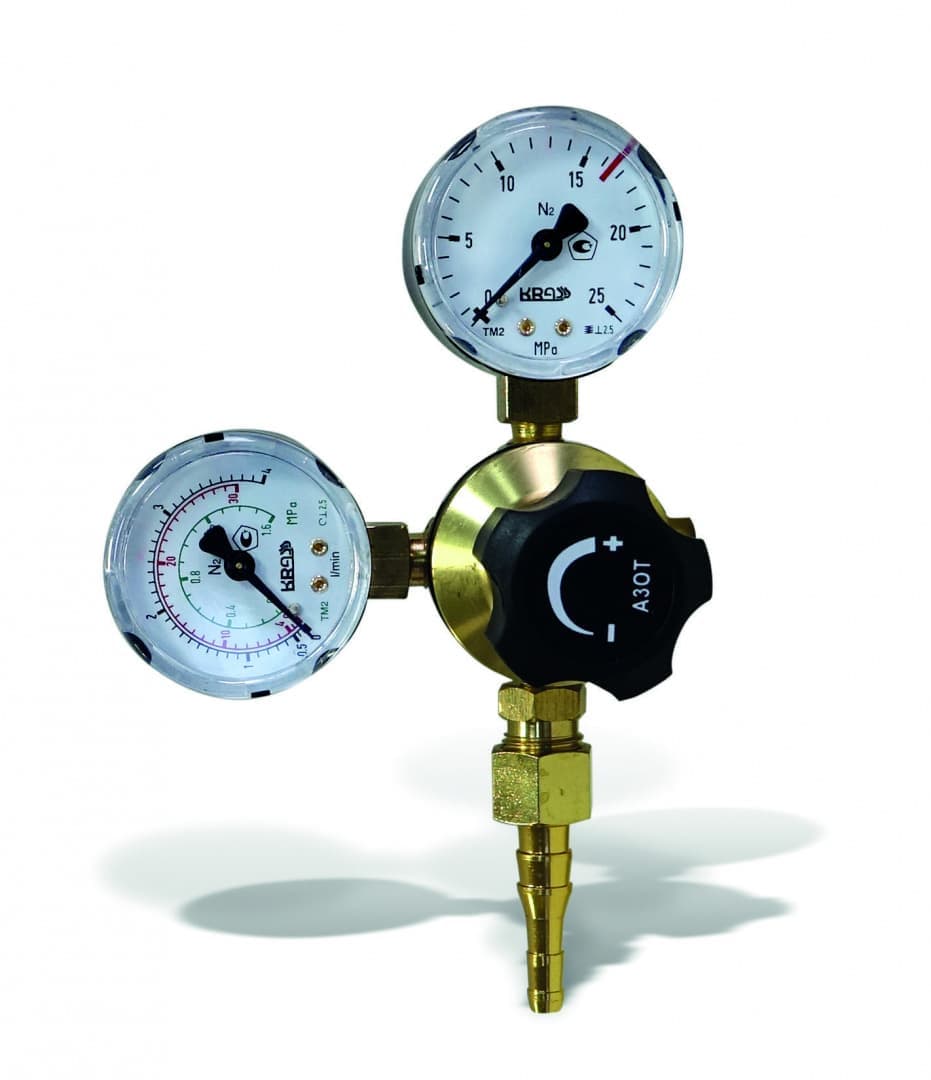 Регулятор модели А-30 от бренда KRASS предназначен для работы с азотом. Способ редуцирования рабочего давления – одноступенчатый пружинный. Контроль давления газа осуществляется на входе и выходе при помощи двух манометров (шкала четкая, на каждой указано давление в трех измерениях Bar/kPa/psi). Климатическое исполнение гарантирует безопасность работы при температуре окружающей среды от -25 до +50 градусов Цельсия.