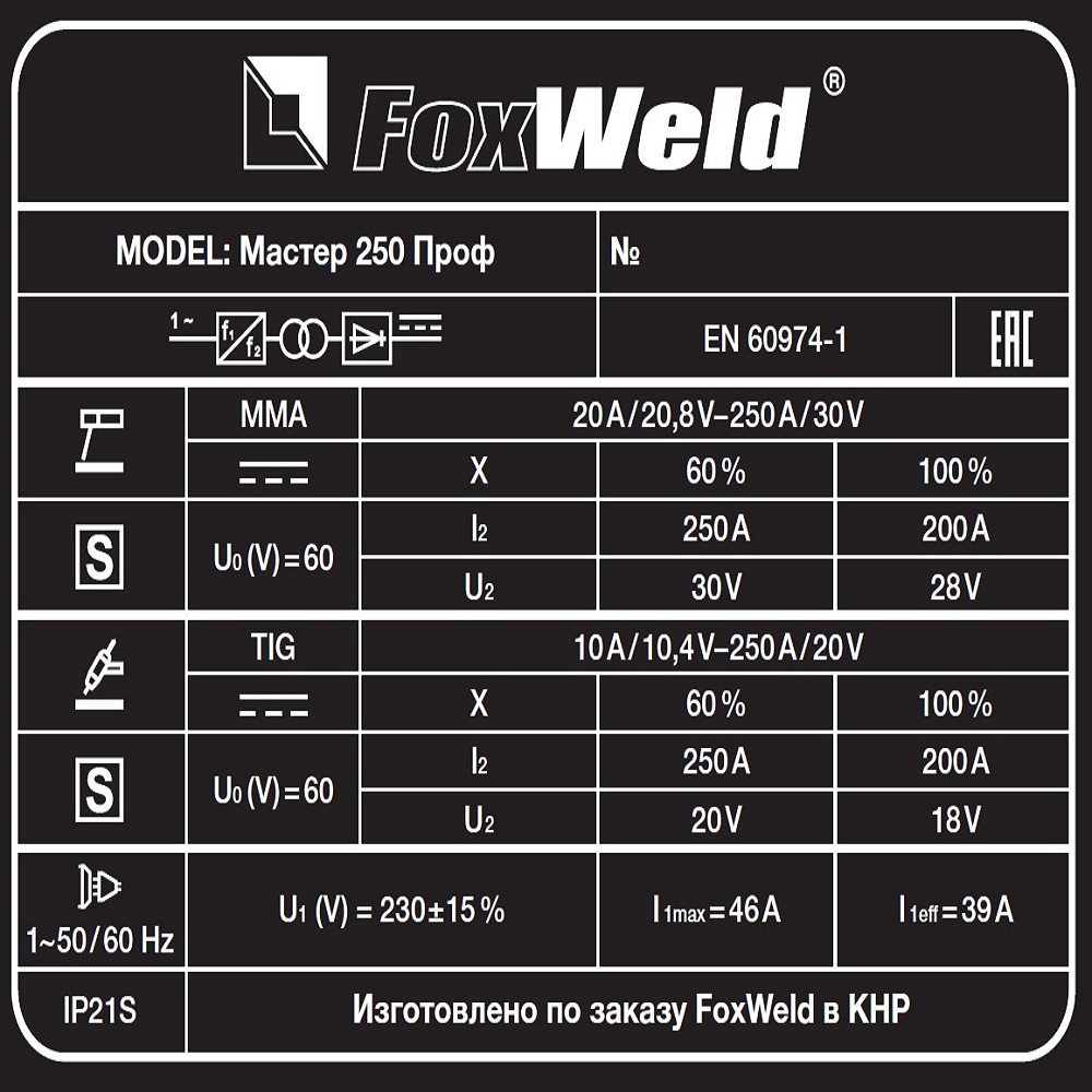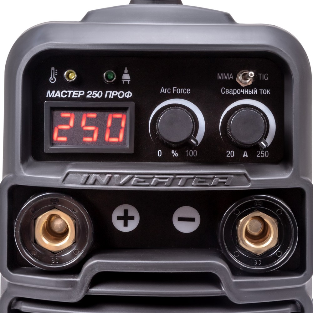 Мастер 250 Проф выполняет сварку ММА плавкими покрытыми электродами и сварку TIG неплавким электродом в среде защитных газов. Переход с одного режима на другой осуществляется переключением тумблера и присоединением к сварочным штекерам соответствующего держателя или аргоновой горелки.