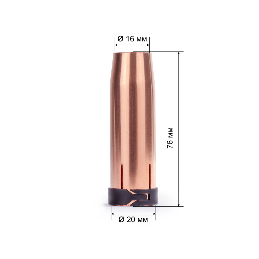 Это сопло обеспечивает стабильную газовую защиту, снижает разбрызгивание металла и повышает качество формирования шва. Диаметр: 16 мм.
