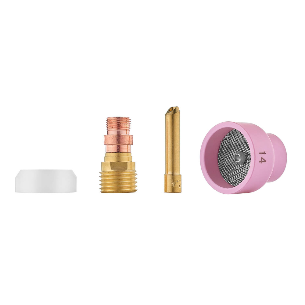 Набор COLISEUM №14 предназначен для TIG горелок TP 17, TP 18 и TP 26, работающих с вольфрамовыми электродами диаметром 2,4 мм. Комплект включает BIG сопло №14, газовую линзу и все необходимые элементы для стабильной и точной аргонодуговой сварки на пониженных и средних токах.