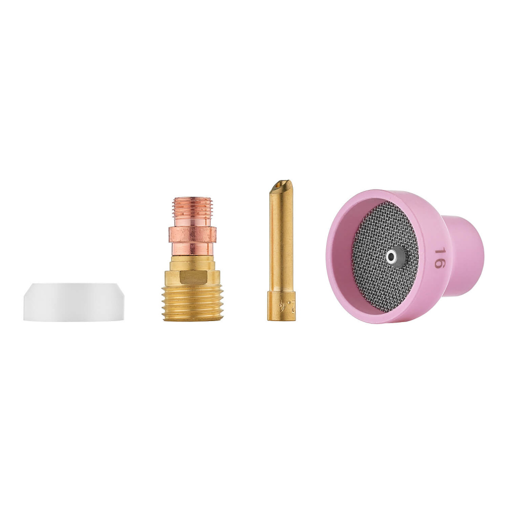 Набор COLISEUM №16 предназначен для TIG горелок TP 17, TP 18 и TP 26, использующих вольфрамовые электроды диаметром 1,6 мм. Комплект включает BIG сопло №16, газовую линзу, цангу и другие компоненты, обеспечивающие стабильную аргонодуговую сварку с высокой степенью защиты сварочной ванны.