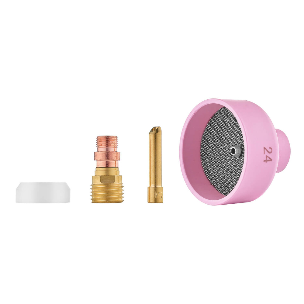 Набор COLISEUM №24 разработан для TIG горелок TP 17, TP 18 и TP 26, работающих с вольфрамовыми электродами диаметром 2,4 мм. Комплект включает BIG сопло №24, газовую линзу, цангу и другие необходимые элементы, обеспечивающие стабильную аргонодуговую сварку с максимальной газовой защитой.