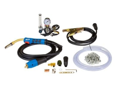 Конструкция аппарата предусматривает, кроме совместимости со стандартной горелкой, возможность подключить горелку Push-Pull. Она обеспечивает точную подачу проволоки, что очень важно для с малым диаметром. Если есть нужда, можно использовать длинный шланговый пакет.Комплектация включает редуктор с подогревом, который подключается к выходу 36 В сзади устройства. Это помогает избежать "замерзания" редуктора и нарушения подачи газа.