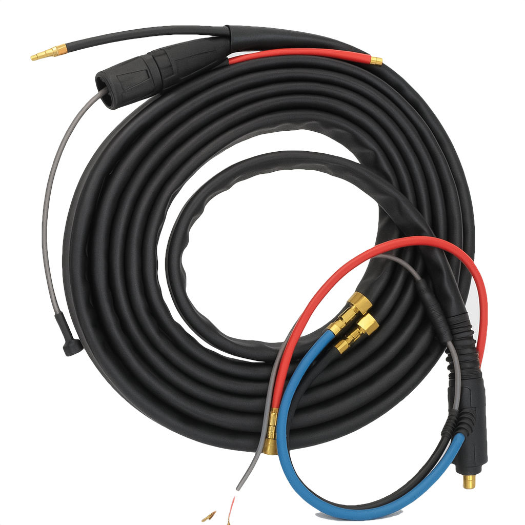 Изготовлен из прочных, термостойких материалов и оснащён надежными разъемами для подключения электрического тока, аргона, охлаждения и управляющих сигналов. Благодаря гибкости и универсальности, он идеально подходит как для профессиональных сварочных цехов, так и для строительных объектов.
