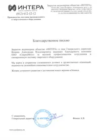 Благодарственное письмо от ЗАО ИНТЕРА»