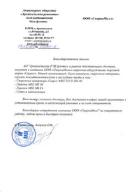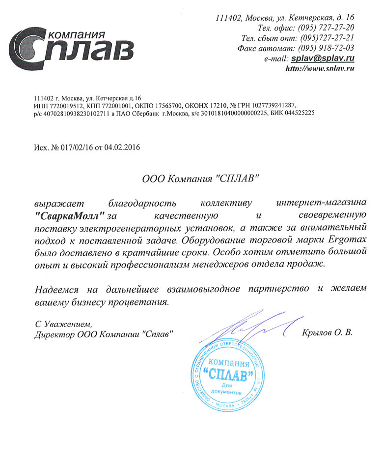 Благодарственное письмо от ООО Сплав