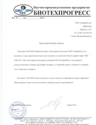 Благодарственное письмо от Биотехпрогресс»