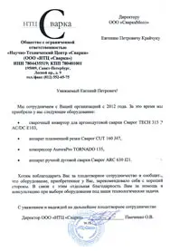 Благодарственное письмо от НТЦ Сварка
