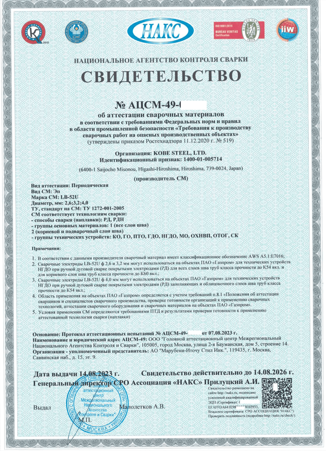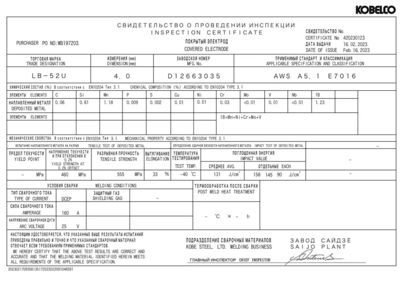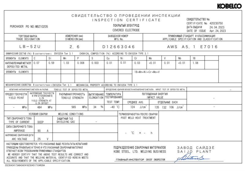 СВИДЕТЕЛЬСТВО О ПРОВЕДЕНИИ ИНСПЕКЦИИ СВАРОЧНЫХ ЭЛЕКТРОДОВ LB52U д 2.6 мм