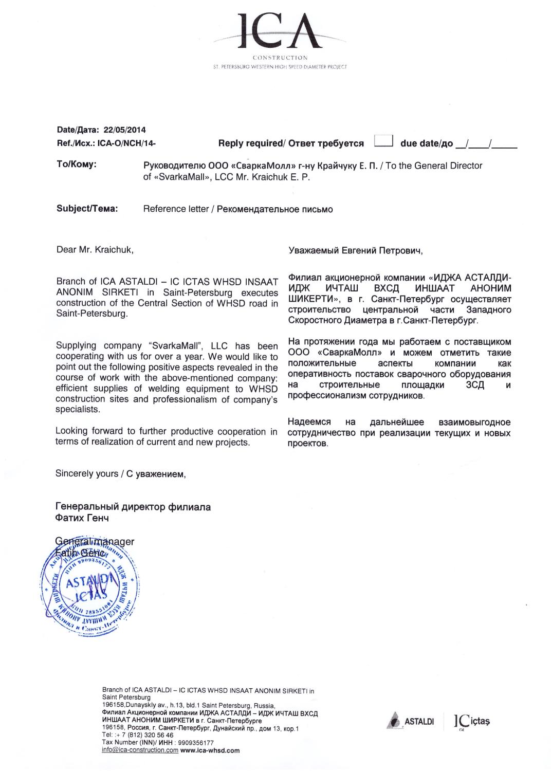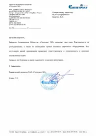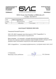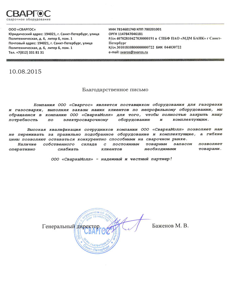 Благодарственное письмо от ООО СВАРГОС