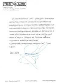 Благодарственное письмо от Трак Гараж