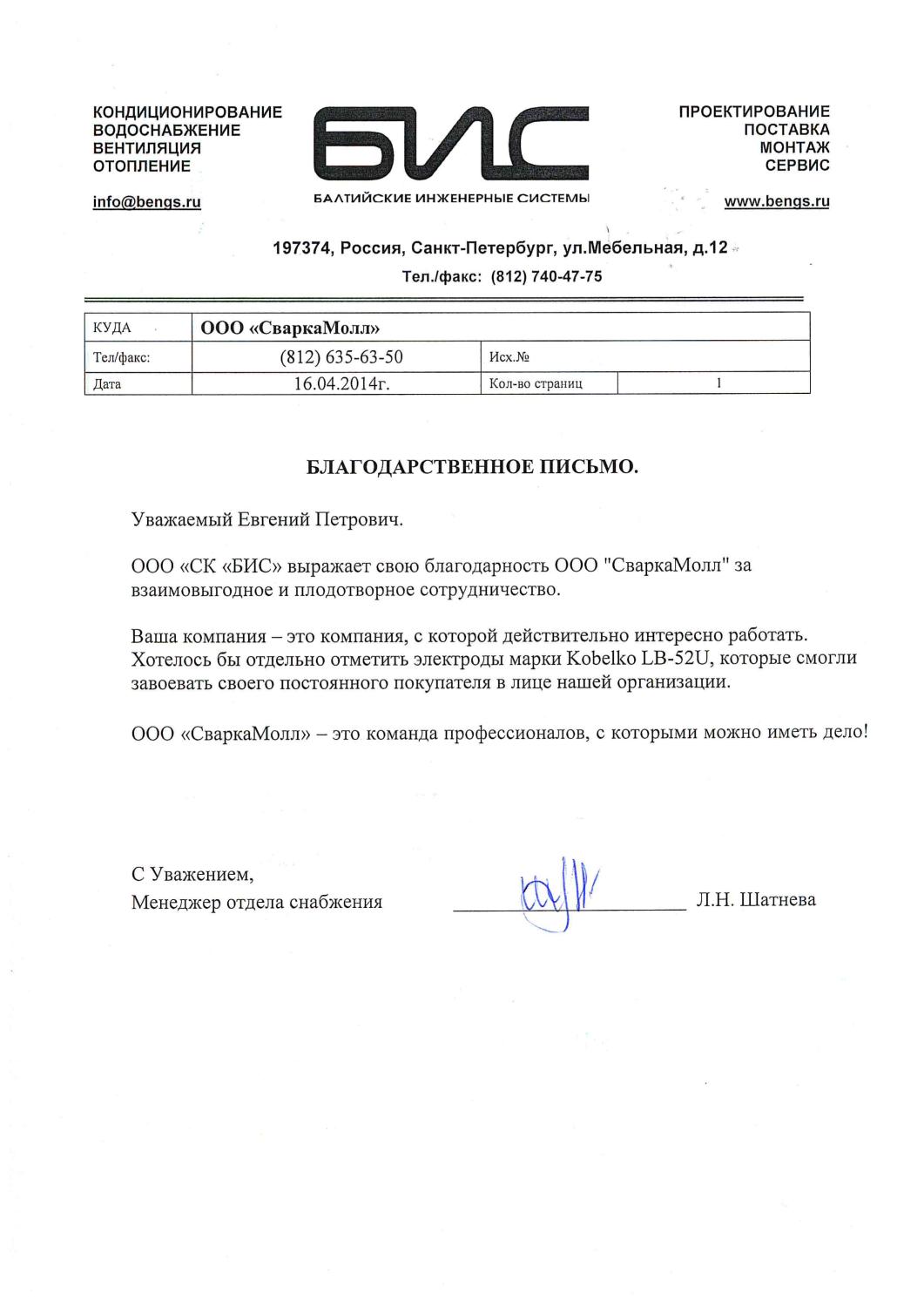 Благодарственное письмо от ООО «СК «БИС»