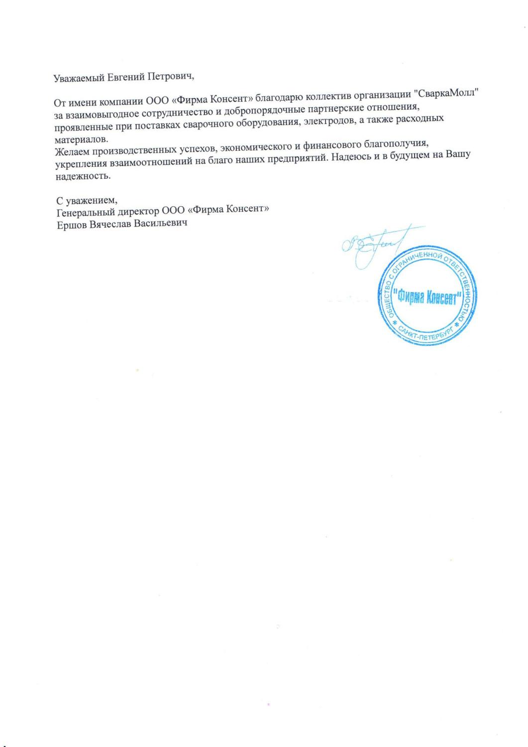 Благодарственное письмо от ООО «Фирма Консент»