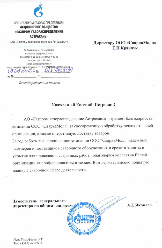 Благодарственное письмо от ОАО Газпром Газораспределение Астрахань